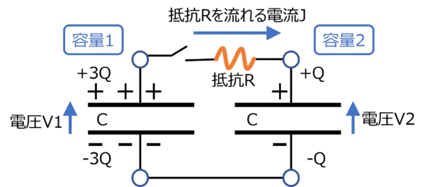 電荷が移動するとき電流が流れる。そのときの抵抗に流れる電流Jを計算する。電荷が時間をかけて移動して混ざり、電荷が等分されるまで移動する。