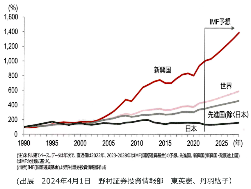 図3-2 世界の名目GDPの推移(1990年を100として指数化)