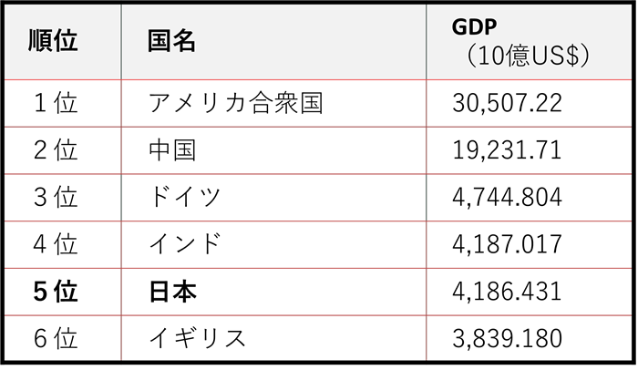 表3-2にIMF発表データを基に作成した最新の世界GDPランキングを示した。日本は成長停滞の結果、中国やドイツ、インドに追い抜かれ、辛うじて5位を維持している。遠からずイギリスにも追い越され、6位へ後退するだろう。