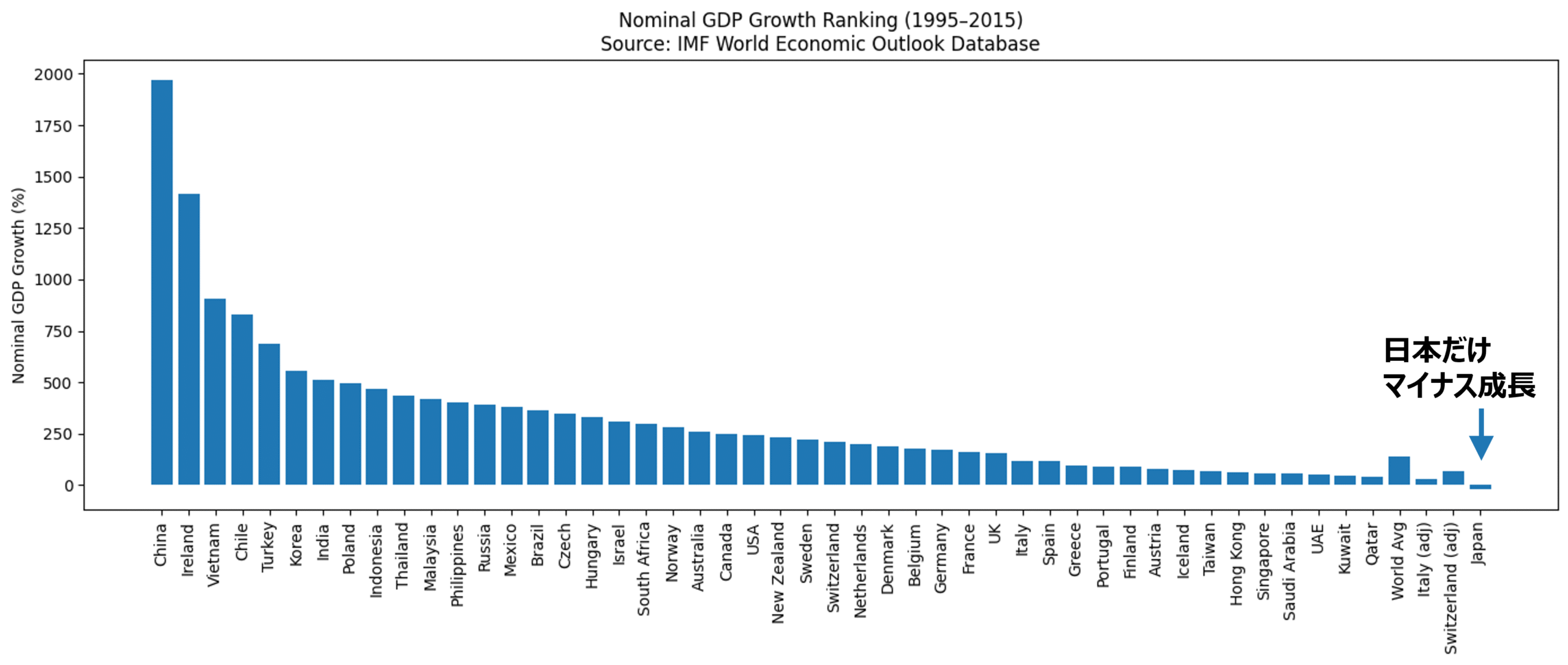 ここでは1995年から2015年までのデータを示しているが、2015年以降も成長が見られないため、日本の成長停滞は30年規模で継続しているといえる。成長率上位にはカタール、ベトナム、中国、インドなどが位置し、日本は唯一マイナス成長となる最下位にあり、その上位にドイツ、ギリシャ、フランス、イタリアが並ぶ。