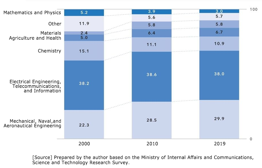 Figure 3-5 presents the distribution of research fields among researchers in Japanese companies. It shows that over the past 20 years, researchers have continued to work in almost the same fields. If the distribution of specialties remains unchanged, this suggests that the industrial structure companies aim for in order to generate profits has also remained largely the same.