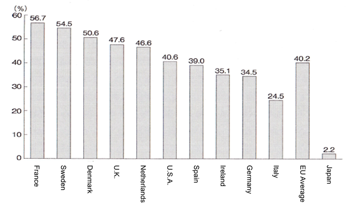 Please look at Figure 3-6, which shows the percentage of children born outside of marriage in developed countries. As of 2012, while the rate in Japan was only 2.2%, it was more than half in countries like Sweden and France. You can see that in other countries, it ranges from 30% to 50%. In short, in some countries, children born to married couples are now a minority. When we compare developed nations, we find that the birthrate is actually higher in these countries.